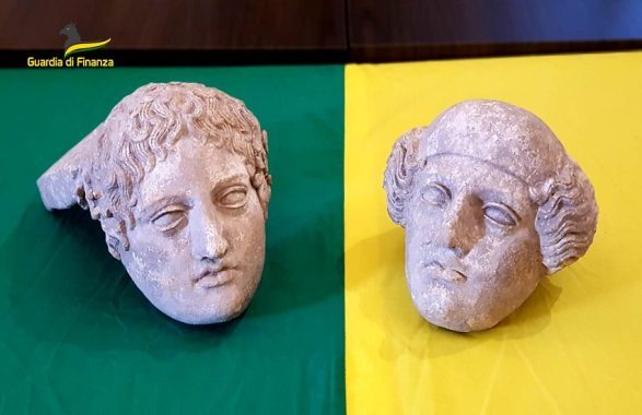 I militari del Comando Provinciale della Guardia di Finanza di Catania, nel corso di un servizio di controllo economico del territorio effettuato in località Belpasso, in un’area di servizio lungo la S.S. 121 “Catanese”, hanno fermato due soggetti siracusani con a bordo dell’auto due pregevoli teste in terracotta di origine ellenica, presumibile frutto di scavi archeologici clandestini. In particolare, durante le attività di controllo sulle rotabili di maggior traffico veicolare, i “baschi verdi” della Compagnia Pronto Impiego di Catania, insospettiti dalle manovre del conducente, hanno proceduto all’ispezione del mezzo ritrovando nel portabagagli un sacchetto di plastica al cui interno, avvolte da carta e vecchi indumenti, vi erano due teste in terracotta raffiguranti il volto di un uomo e di una donna, la cui foggia richiamava antiche sculture greche.