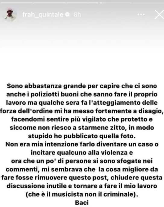 Lo stesso Frah Quintale aveva descritto l’atteggiamento delle forze dell’ordine durante il suo concerto come un monitoraggio piuttosto che come una protezione: “Qualche giorno fa tornando in backstage dopo un concerto pensavo di aver sbagliato strada e di essere finito in commissariato. Davanti a noi una quindicina tra poliziotti e carabinieri affollavano la zona dei camerini tenendo me e tutta la mia crew costantemente monitorati. A nostra disposizione avevamo già la sicurezza del festival e anziché trovare un clima sereno, ho avuto la sensazione che le forze dell’ordine fossero lí per tenerci sotto controllo più che per proteggerci”. La foto invece è stata pubblicata con la frase “Se mi guardi così”. L’artista ha comunque cercato di chiarire il tutto dicendo: “La foto che ho postato è stato un gesto indelicato e qualcuno si è molto arrabbiato ma onestamente andare a fare il mio lavoro e vedere me e il mio team trattati come potenziali criminali senza un motivo specifico mi ha fatto innervosire e reagire in quel modo. Questo il perché della caption: ‘se mi guardi così’ visto che i ragazzi ci hanno tenuto d’occhio per un paio di ore abbondanti post concerto”. La posizione del sindacato della Polizia è stata invece la seguente: “Addolora imbattersi in chiari messaggi di violenza mediatica e di palese disprezzo verso lavoratrici e lavoratori della Polizia di Stato che ogni giorno, anche a rischio della propria incolumità, garantiscono la sicurezza di tutti”.