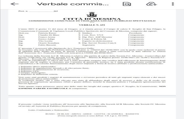 La commissione comunale di vigilanza pubblico e spettacoli del comune di Messina, con verbale dell’ 11 giugno 2021, ha dato parere non favorevole allo svolgimento delle suindicate partite con la presenza del pubblico, adducendo motivazioni inerenti gravi omissioni da attribuire a chi Ella vorrà meglio individuare. Invero, secondo gli impegni presi dal Comune e dalla Società concessionaria dello Stadio Franco Scoglio sino al 31.05.2021, questa avrebbe dovuto anche fare i lavori di adeguamento addirittura per la serie C, quindi, avrebbe dovuto curare anche l’adeguamento dello Stadio per dare la possibilità ai propri tifosi ed a quelli della società Fc Messina, che ha sempre pagato alla stessa il canone di affitto, di assistere alle partita in presenza alla prima occasione utile e sino al numero di spettatori consentito, previsto dalle normative vigenti.
