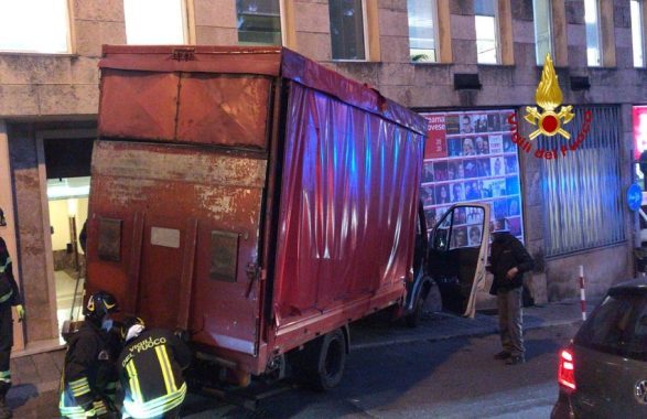 Fortunatamente nessuna persona è rimasta coinvolta. Il conducente è rimasto bloccato all’interno ed è stato estratto dai Vigili del fuoco, che si stanno occupando anche della rimozione del furgone dai locali.