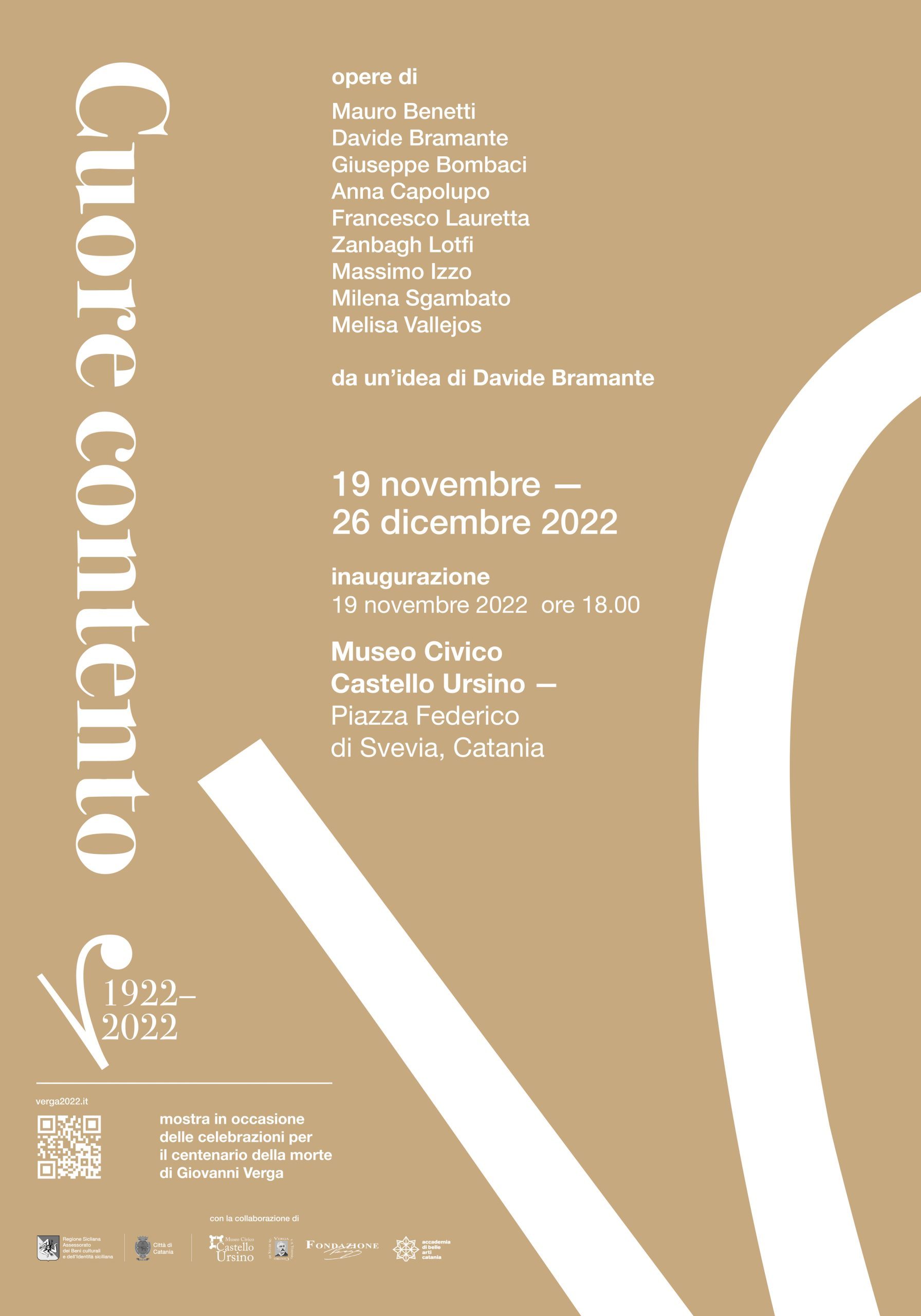A curare il visual, il progetto grafico del catalogo, le foto del materiale d’archivio e l’allestimento dell’esposizione documentaria è l’Accademia di Belle Arti di Catania, che gestisce anche la sezione “Cuore contento” di opere di arte contemporanea di nove autori, da un’idea di Davide Bramante per dare forma, segno e colori alle parole di Verga. La mostra sarà aperta al pubblico, con ingresso incluso nel biglietto del museo civico, tutti i giorni dal lunedì alla domenica, dalle ore 9 alle 19 (ultimo ingresso ore 18). Per maggiori informazioni è possibile visitare il sito delle celebrazioni ufficiali www.verga2022.it.