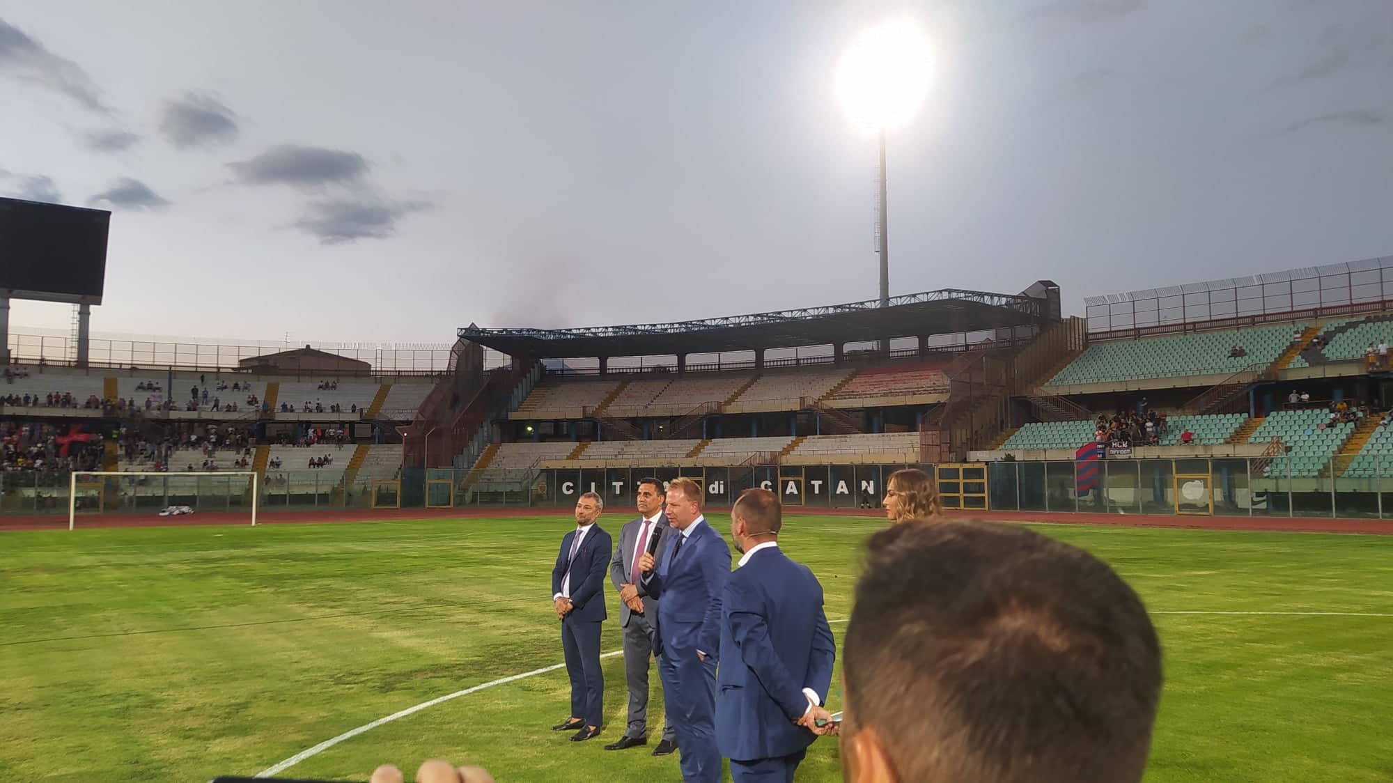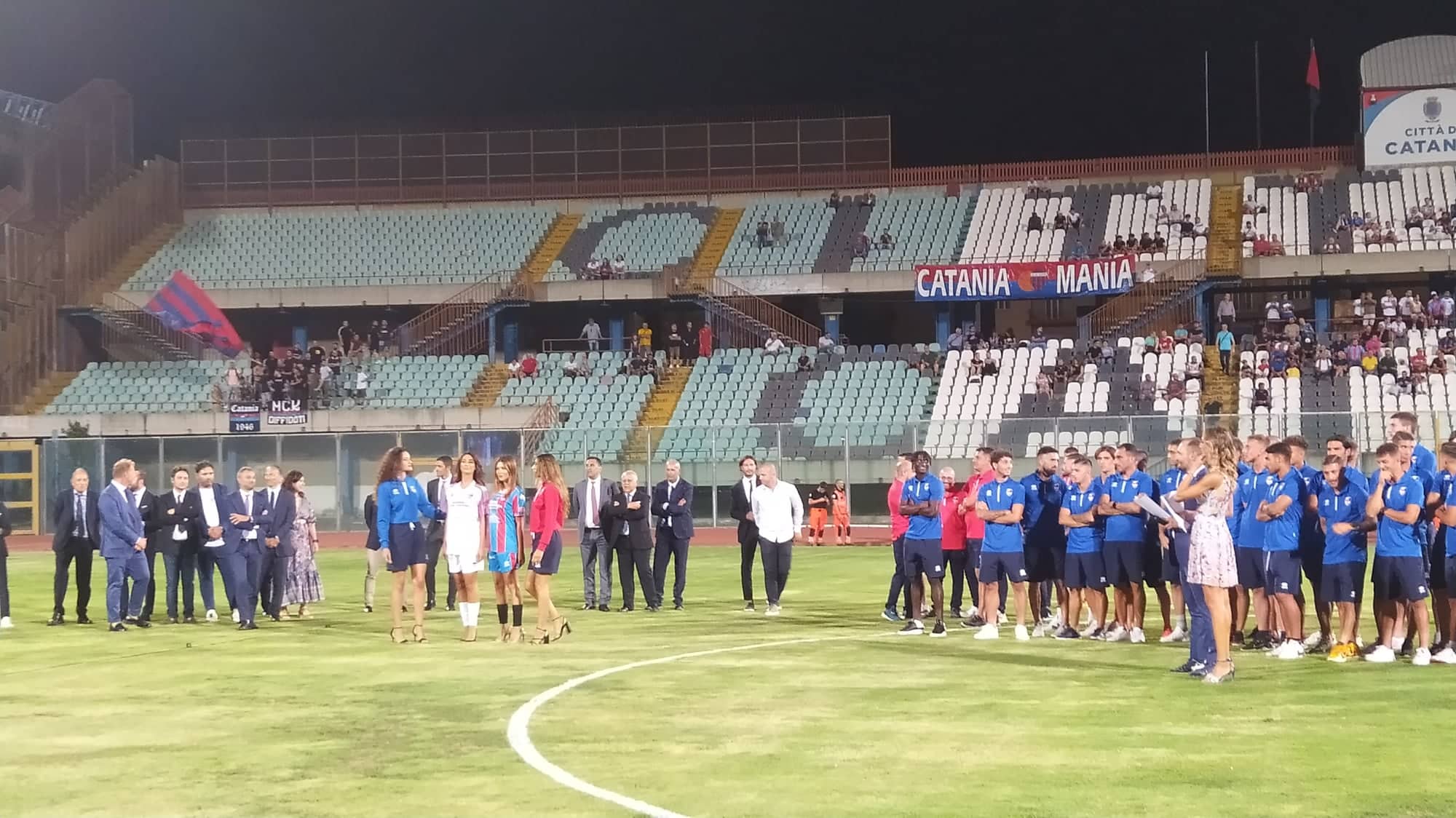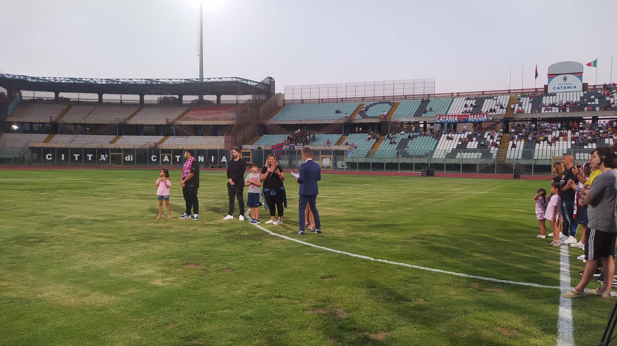 L’inizio è stato riservato a Di Marzio, che in quanto figlio dell’allenatore Gianni, che ha portato il Catania in Serie A nel 1983, ha letto un monologo di dedica alla Catania sportiva a testimonianza del suo grande legame con il capoluogo etneo. In seguito è toccato Giusy Malato, ex pallanuotista catanese e tifosissima del Catania, che ha ringraziato il pubblico. Così hanno fatto il loro ingresso in campo il vicepresidente Vincenzo Grella, il consigliere d’amministrazione Giovanni Caniglia e il direttore generale Luca Carra, che hanno ricordato come il presidente Ross Pelligra, assente dal vivo fosse presente con il pensiero.