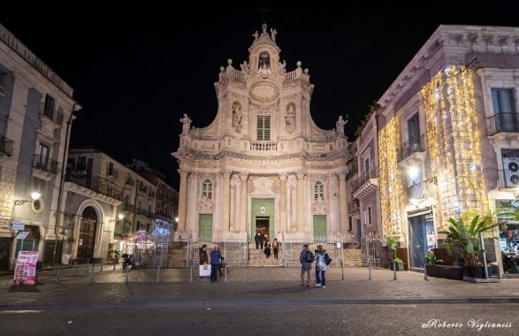 E luci accese anche per la facciata della Basilica Collegiata in via Etnea e anche in via dei Crociferi, cuore storico della città con un’atmosfera tutta nuova che risalta l’arco d’ingresso in pietra lavica della Chiesa di San Benedetto e gli altri due monumenti ecclesiastici, intitolati a San Giuliano e San Francesco Borgia che compongono il simbolo del barocco catanese, in una delle strade più filmate e fotografate dell’Italia.