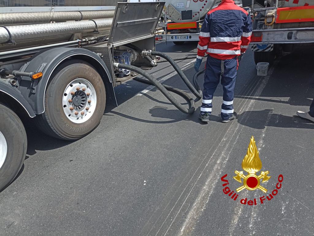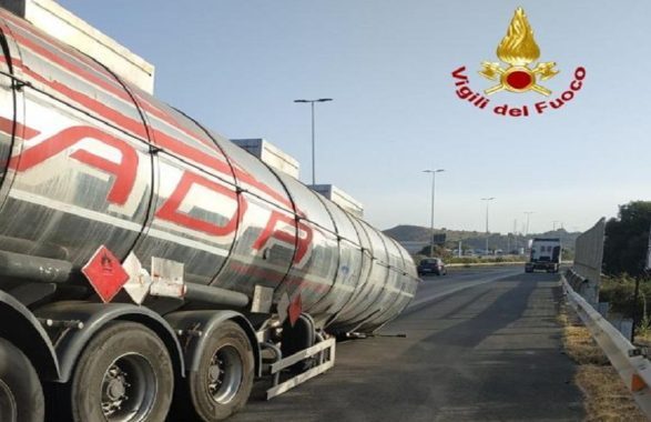 Questo ha provocato un danneggiamento, seppur lieve, della cisterna che si è adagiata sull’asfalto incolonnandosi in avanti. Quindi, per ragioni di sicurezza, non è possibile il proseguimento della marcia e si tende necessario il travaso sul posto della sostanza in altra autocisterna. La delicatissima fase di travaso, data la temperatura di oggi di quasi 40 gradi, è appena cominciata e le carreggiate sono entrambe chiuse.