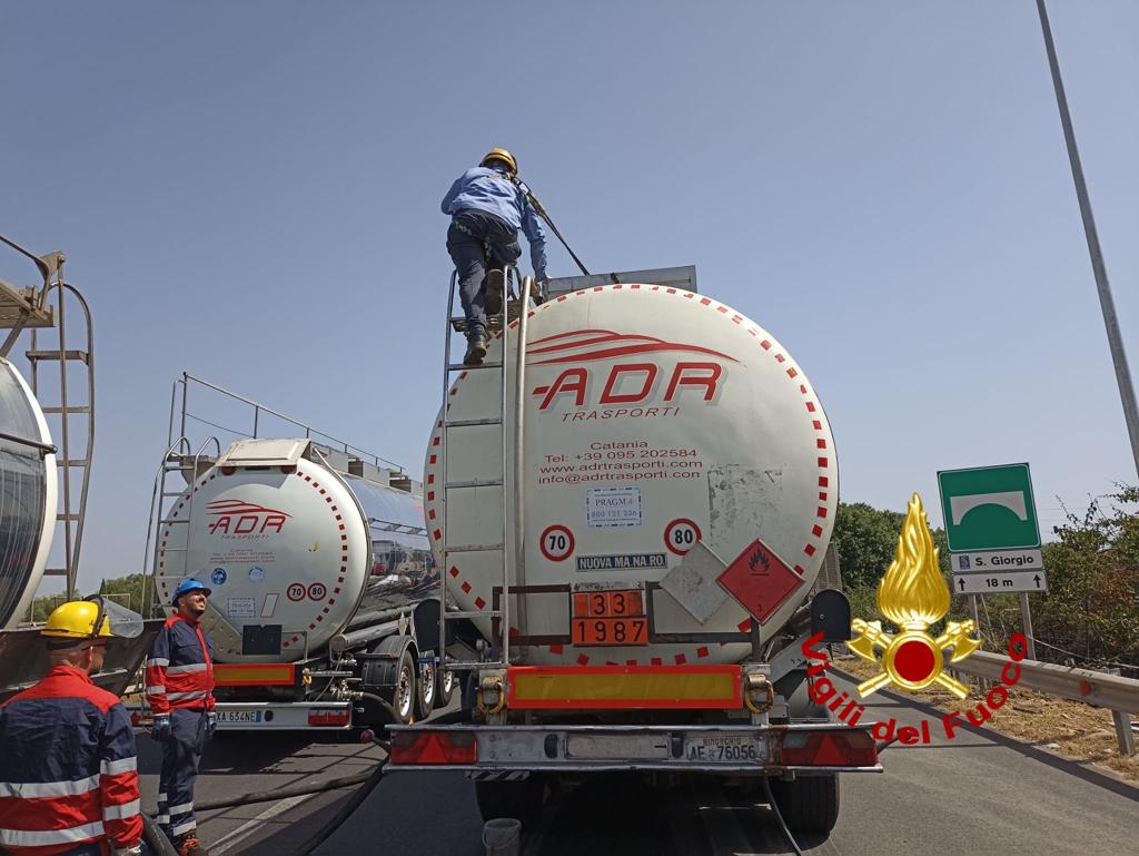 Sulla Tangenziale di Catania è in atto un intervento dei Vigili del Fuoco su una cisterna contenente alcool benzilico (numero ONU 1987), una sostanza altamente infiammabile.