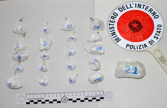 Infatti, nella tasca del giubbotto, all’interno di una busta di cellophane, i poliziotti della sezione investigativa del Commissariato di P.S. hanno trovato 19 involucri di cocaina.