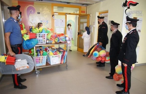 Dopo le tante operazioni di solidarietà svolte in varie fasi dell’anno, come per esempio in occasione del Santo Natale, ancora un gesto dei carabinieri e delle forze dell’ordine più in generale per cercare di regalare un sorriso a chi è più in difficoltà, come i poveri bambini ricoverati in ospedale nei reparti di onco-ematologia. I carabinieri del comando della Compagnia di Campi Salentina e della stazione di Porto Cesareo, infatti, si sono recati presso il reparto di onco-ematologia pediatrica del Vito Fazzi di Lecce, dove hanno consegnato dei giochi da mare per i piccoli pazienti ricoverati. L’iniziativa si è concretizzata grazie alla collaborazione di Assunta Tornesello, direttrice responsabile del reparto, che ha ringraziato l’arma per il gesto dei carabinieri e per l’amorevole vicinanza ai loro piccoli ospiti. I giochi donati erano stati sequestrati dai carabinieri lo scorso 6 agosto 2021 a Porto Cesareo dopo un’operazione di polizia giudiziaria che aveva portato al controllo di sette bancarelle abusive.