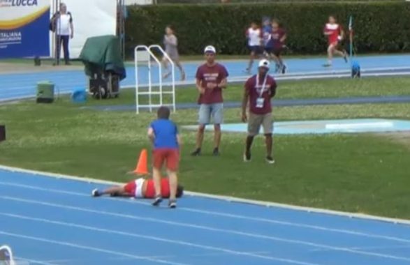 Parte lo sprint finale e i due giovani atleti si impegnano al massimo delle loro energie per conquistare la vittoria, ma proprio qui si verifica un incidente: le gambe dei due ragazzini forse si toccano e così l’atleta in maglia biancorossa cade rovinosamente a terra.