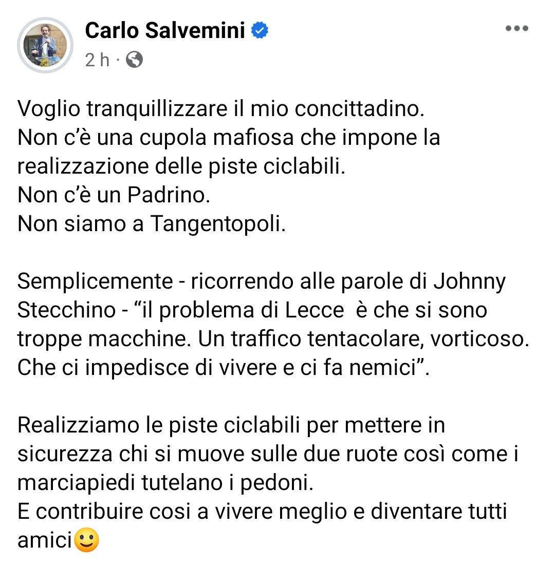 Non si è fatta attendere la risposta del sindaco che ha affidato ad un post sui social la replica alle pesanti accuse, circa il giallo in città. “Voglio tranquillizzare il mio concittadino. Non c’è una cupola mafiosa che impone la realizzazione delle piste ciclabili. Non c’è un Padrino. Non siamo a Tangentopoli. Semplicemente – ricorrendo alle parole di Johnny Stecchino – ‘il problema di Lecce è che ci sono troppe macchine. Un traffico tentacolare, vorticoso. Che ci impedisce di vivere e ci fa nemici’. Realizziamo le piste ciclabili per mettere in sicurezza chi si muove sulle due ruote così come i marciapiedi tutelano i pedoni. E contribuire cosi a vivere meglio e diventare tutti amici”.