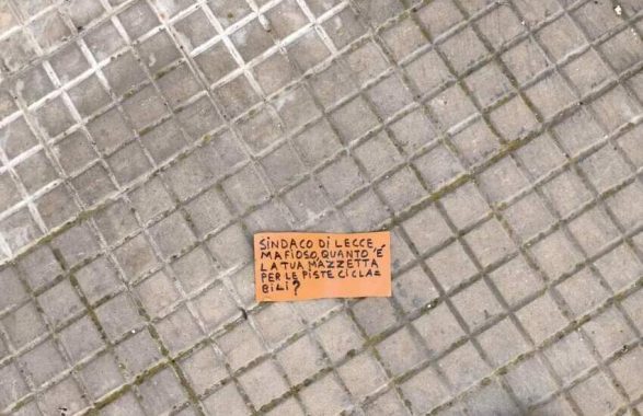 Dopo l’agguato nel quartiere stadio di qualche giorno fa, ancora un giallo in città anche se di tutt’altro tenore. “Sindaco di Lecce, mafioso, quanto è la tua mazzetta per le piste ciclabili”. È questo il messaggio, e le accuse pesanti contro il primo cittadino del capoluogo salentino, contenute all’interno di un bigliettino anonimo trovato per strada, questa mattina in città, su via XXIV Maggio, strada interessata da un cantiere. Dietro un episodio che appare fine a sé stesso, l’avversione istintiva di una parte della cittadinanza per la mobilità sostenibile. In via XXIV Maggio, infatti, l’amministrazione comunale sta realizzando delle piste ciclabili che hanno l’obiettivo di unire il centro storico con la periferia. Un intervento che non piace a molti residenti della zona perché, a loro dire, in alcuni casi ha sottratto dei posti auto.
