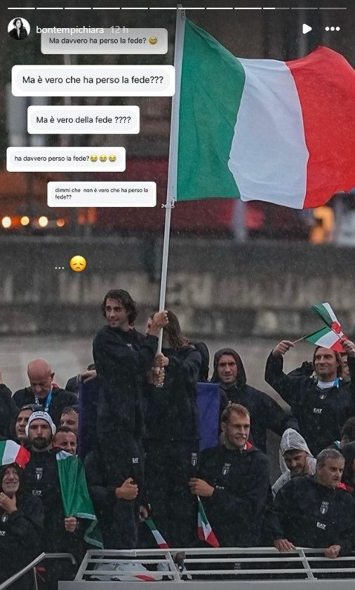 Come previsto dalla cerimonia, il battello della delegazione italiana stava attraversando la Senna, mentre Tamberi sventolava festosamente e orgogliosamente il tricolore. Un momento immortalato dalla stessa moglie, Chiara Bontempi, che tra le sue Storie ha pubblicato un video dove Tamberi sventolava il tricolore con questa frase: “Amore mio. Completamente bagnati ma felici!”.