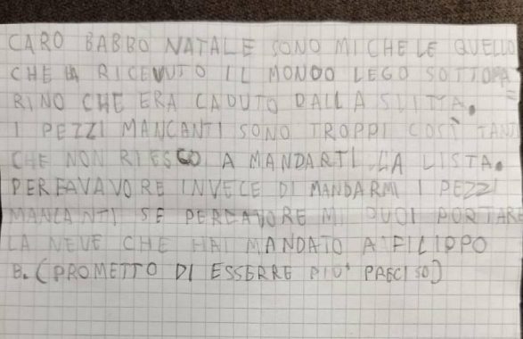 Lo scorso 3 gennaio, Michele ha scritto una “Lettera di rinvio per Babbo Natale” raccontando con dolcezza di un regalo, il “mondo Lego sottomarino”, che purtroppo risultava incompleto a causa di troppi pezzi mancanti. Nella sua lettera, il ragazzino ha chiesto a Babbo Natale di portargli un’altra cosa speciale: “la neve che hai mandato a Filippo B.”