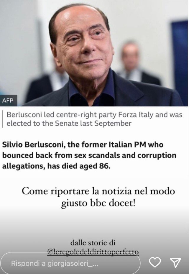 Poi ce n’era un altro della Bbc che commentava così la morte di Berlusconi: “Silvio Berlusconi, l’ex Primo Ministro italiano che si è ripreso da scandali sessuali e accuse di corruzione, è morto a 86 anni”, accompagnato dalla scritta della Soleri: “Come riportare la notizia nel modo giusto. Bbc docet”.