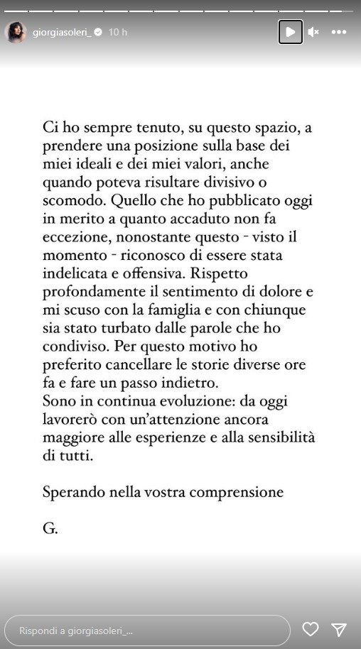 Pur restando ferma sulle sue idee, Giorgia Soleri ammette di aver esagerato e quindi chiede scusa ai suoi follower: “Rispetto profondamente il sentimento di dolore e mi scuso con la famiglia e con chiunque sia stato turbato dalle parole che ho condiviso. Per questo motivo ho preferito cancellare le storie diverse ore fa e fare un passo indietro”.