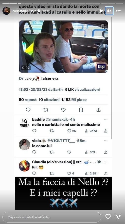 Carlotta, sotto un post che parlava della buffa vicenda, ha commentato laconicamente: “Parlando del nulla”. La stessa Carlotta ha anche condiviso la vicenda in una Storia, aggiungendo: “Ma la faccia di Nello?? E i miei capelli?”.