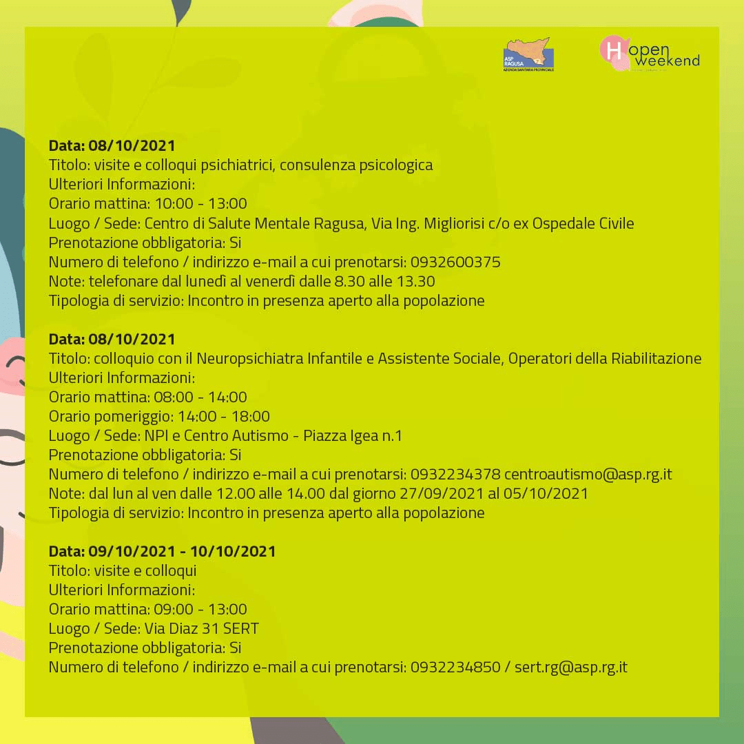 Fondazione Onda, Osservatorio Nazionale sulla salute della donna e di genere, da sempre attenta al tema della salute mentale, lancia la nuova edizione dell’(H)-Open Weekend che si terrà dall’8 al 10 ottobre presso gli oltre 160 ospedali del network Bollini Rosa e presidi dedicati alla salute mentale che hanno aderito all’iniziativa rivolta alle donne che soffrono di ansia, depressione, schizofrenia, disturbi dell’umore e del sonno, psicosi e disturbi del comportamento alimentare. Anche l’Asp di Ragusa offre gratuitamente i suddetti servizi clinico-diagnostici e informativi.