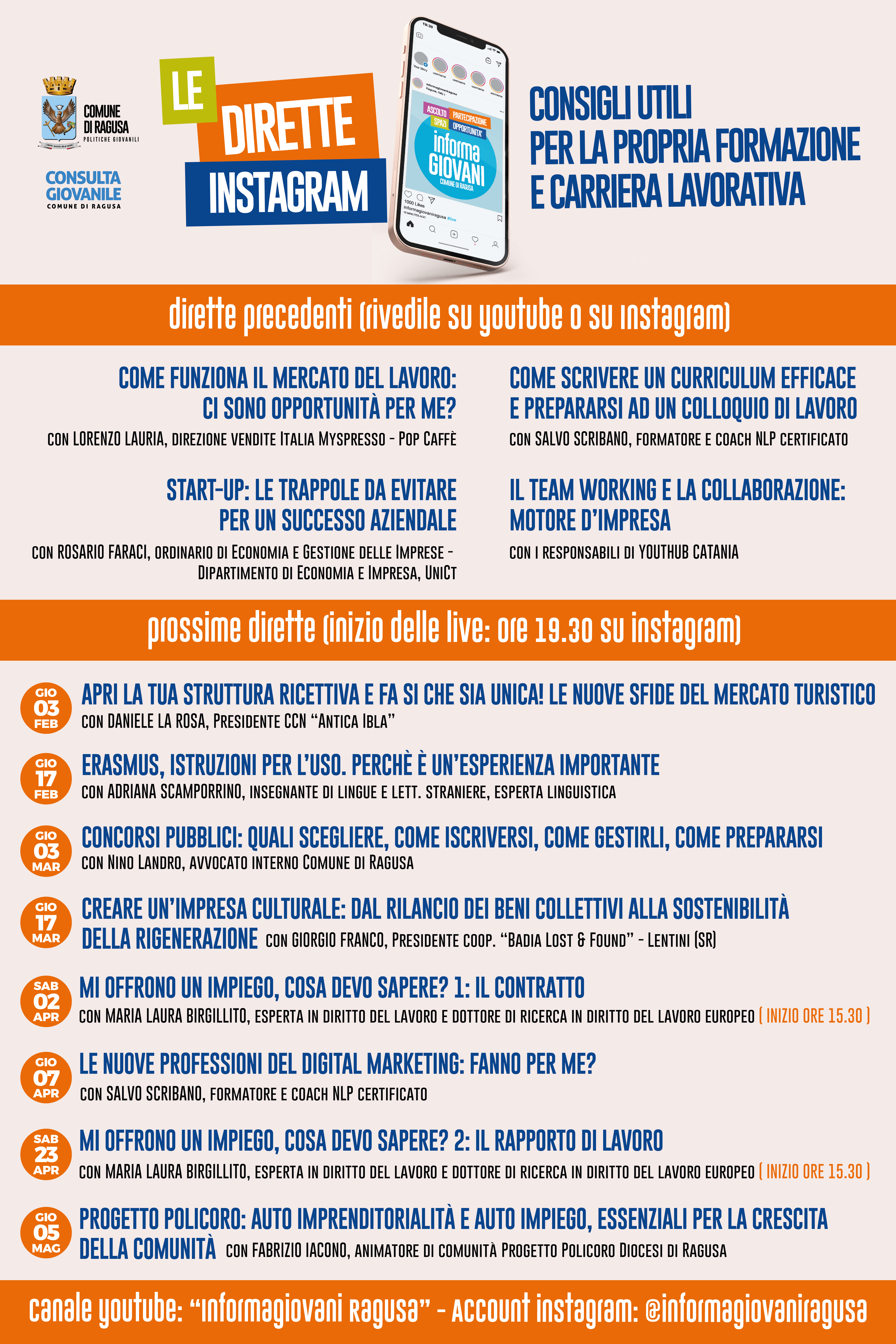 Prosegue il ciclo di dirette dedicate a formazione e opportunità lavorative per i giovani, curate dall’informagiovani comunale. Dopo i primi quattro incontri, molto partecipati – che possono essere rivisti sul canale YouTube “Informagiovani Ragusa” o sull’account Instagram @informagiovaniragusa – in cui si è parlato di come funziona attualmente il mercato del lavoro, degli errori da evitare per dare vita ad una start-up di successo, di come realizzare un curriculum efficace e affrontare un colloquio di lavoro, di quanto il team working e il fare rete tra giovani imprese sia fondamentale, i nuovi appuntamenti proseguiranno a partire da giovedì 3 febbraio fino al 5 maggio prossimo.