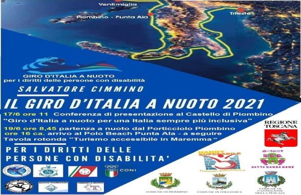 Sabato 19 giugno approda a Piombino la seconda tappa toscana del “Giro d’Italia a nuoto 2021, per una Italia sempre più inclusiva”, l’impresa di Salvatore Cimmino, atleta con disabilità motoria, che prevede il giro della penisola in 14 tappe da circa 20 km. Nell’occasione Cimmino percorrerà la tratta che va dal porticciolo di Piombino al Polo Beach di Punta Ala. La partenza è prevista per le 8:45 e l’arrivo alle ore 16 circa.