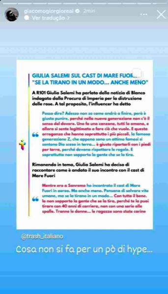 Giacomo Giorgio, che nella serie tv interpreta Ciro Ricci, ha condiviso nelle sue Storie Instagram un post di Trash Italiano, dove venivano riproposte le parole della Salemi, sotto il quale c’era scritto: “Cosa non si fa per un po’ di hype”. Poco dopo la Storia è stata cancellata, forse per non alimentare ulteriori polemiche.