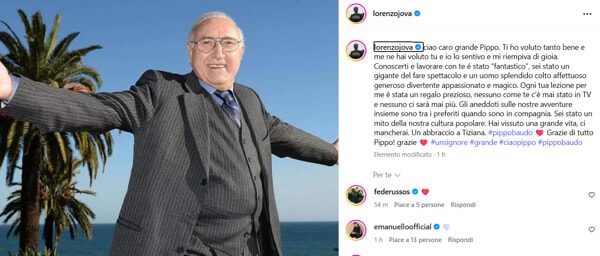 Jovanotti ha definito Baudo “un gigante del fare spettacolo e un uomo splendido, colto, affettuoso e generoso”, ricordando le avventure condivise come “un regalo prezioso”.