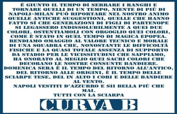 Attraverso un volantino infatti, i capi dei gruppi che riempiono il settore più vicino alla squadra hanno deciso di essere presenti domenica sera. Infatti era da un bel po’ che le curve del Maradona non vedevano il supporto attivo dei tifosi.