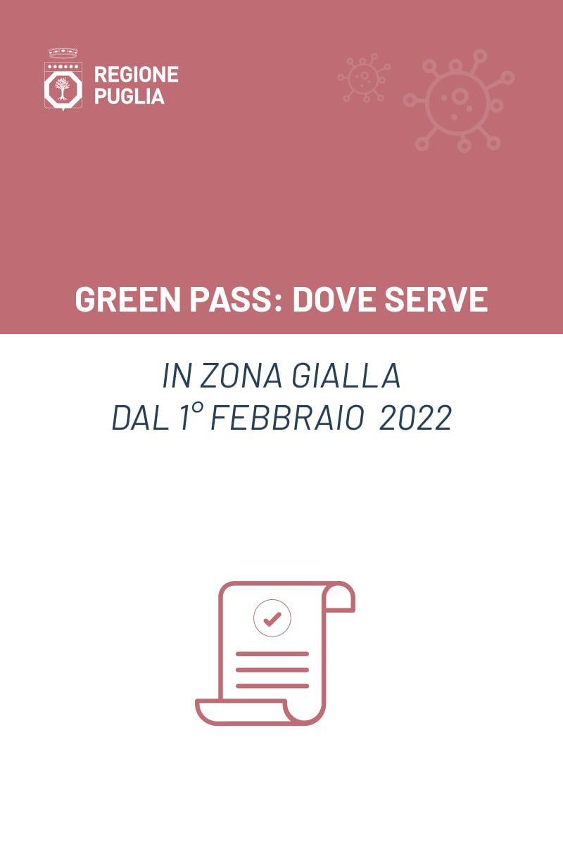 Come deciso dal governo Nazionale da domani cambiano alcune regole sull’utilizzo del Green pass, sia base che rafforzato, e sull’obbligo vaccinale per gli over 50. Da martedì 1 febbraio, quindi, secondo le disposizioni nazionali, si amplia l’elenco delle attività e dei servizi in cui l’accesso è consentito solo a chi possiede il Green Pass, base o “rafforzato”. La Regione Puglia mette a disposizione di tutti un’iconografica riepilogativa sulle singole modalità d’accesso per facilitare l’accesso alle linee guida che entreranno in vigore da domani. Regole e linee guida su come e dove sarà obbligatorio il Green pass, base o rafforzato, scaricabile in PDF a questo indirizzo: http://rpu.gl/GreenPass-1febbraio. La Regione Puglia, inoltre, fa sapere che il Green Pass “base” si ottiene con vaccinazione, guarigione e tampone antigenico rapido/molecolare, mentre il Green Pass “rafforzato” si ottiene esclusivamente dopo vaccinazione e guarigione. Approfondisci sul portale tematico Salute, sport e buona vita: http://rpu.gl/HxEkU