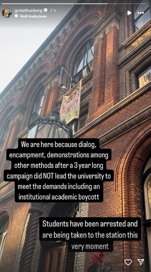 L’attivista svedese è stata arrestata durante una manifestazione all’Università di Copenaghen insieme al movimento “Studenti contro l’Occupazione” per protestare contro la guerra a Gaza. La notizia è stata comunicata dal quotidiano Ekstra Bladet, ma la stessa Thunberg tra le sue Storie su Instagram ha pubblicato un video in cui spiegava che si trovava insieme agli “Studenti contro l’Occupazione” nell’edificio dell’amministrazione dell’Università di Copenaghen, aggiungendo che la polizia stava intervenendo per cacciare i manifestanti.