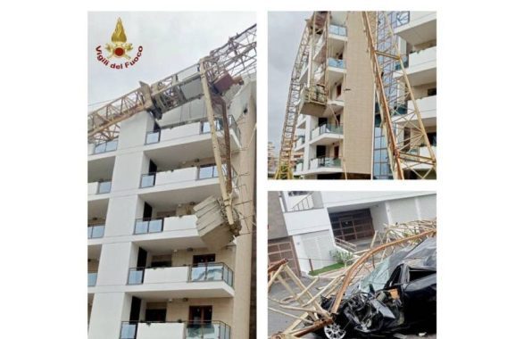Una gru crolla su una strada, distruggendo un’auto e danneggiando un palazzo