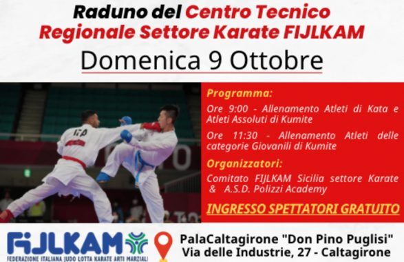 Al PalaCaltagirone “Don Pino Puglisi” , giorno 9 ottobre, si terrà il Raduno del Centro tecnico regionale settore Karate FIJLKAM, all’interno del quale verranno selezionati gli atleti per i prossimi impegni agonistici. Saranno presenti circa 200 atleti siciliani, tra di loro vi sono campioni regionali, italiani e anche internazionali.