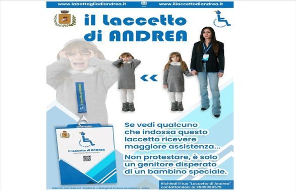 Asia Marcucci, presidente dell’associazione “La Battaglia di Andrea” che si occupa di tutelare i soggetti disabili, ha lanciato l’iniziativa “Il laccetto di Andrea”. Un oggetto che ha la funzione di aiutare il padre e la madre di persone diversamente abili che si trovano in difficoltà.