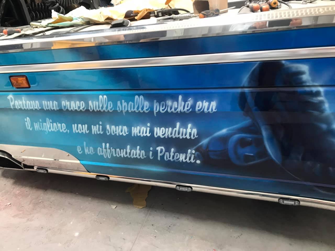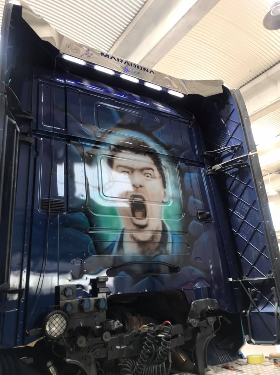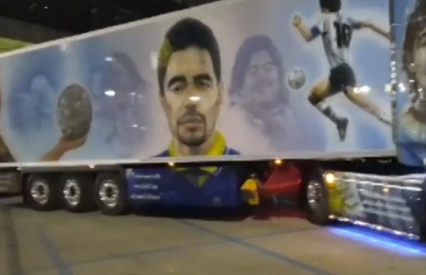 L’autoarticolato è infatti una vera e propria opera d’arte, contraddistinta da tante figure che ritraggono il campione argentino in tutte le fasi della sua vita.