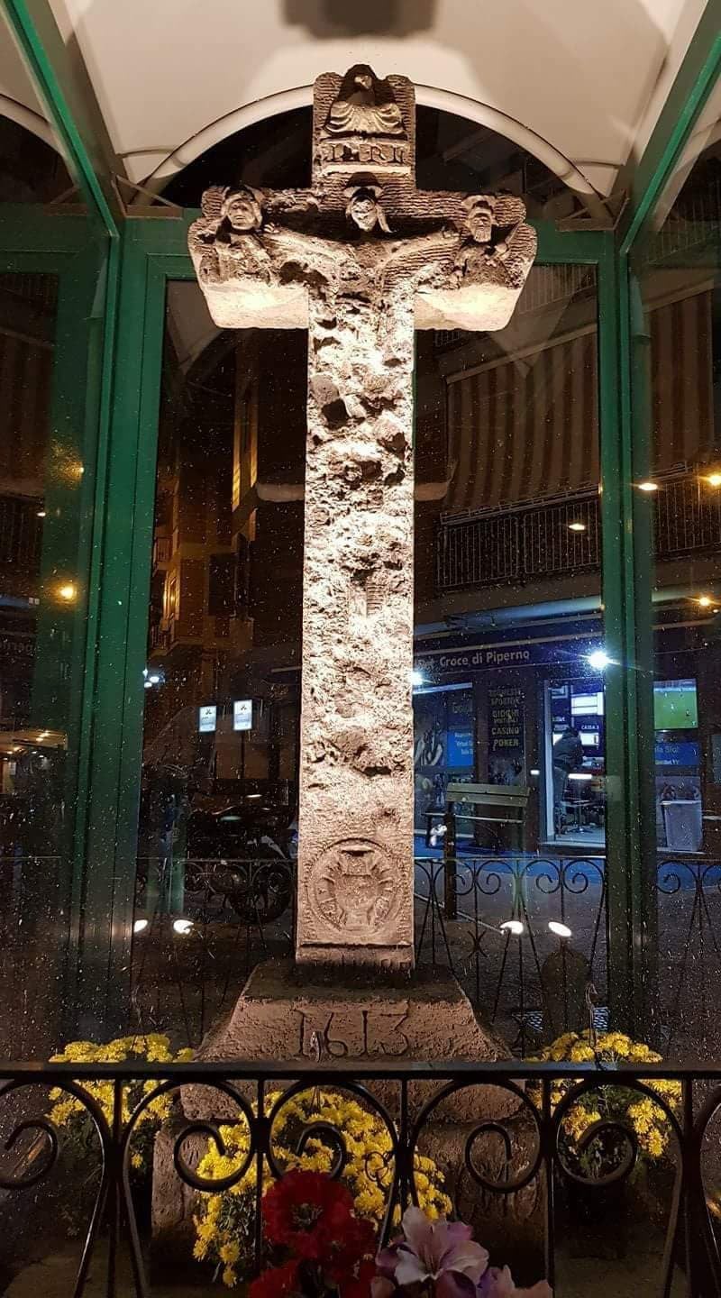 Tale croce fu scolpita in stile celtico nel 1613 dai Pipernieri di Soccavo ed è adornata da teschi, chiodi della corona di spine, una giara da cui si espandono raggi di luce ed altri misteriosi simboli esoterici e cristiani.