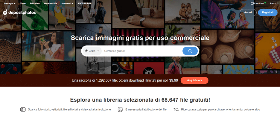 Si tratta di una delle agenzie stock più popolari e conosciute al mondo. È stata fondata nel 2006 e questo è segno di una affidabilità sicuramente importante. Sul it.depositphotos.com oltre al suo enorme archivio di foto a pagamento è possibile accedere alla vastissima sezione di immagini completamente gratuite.