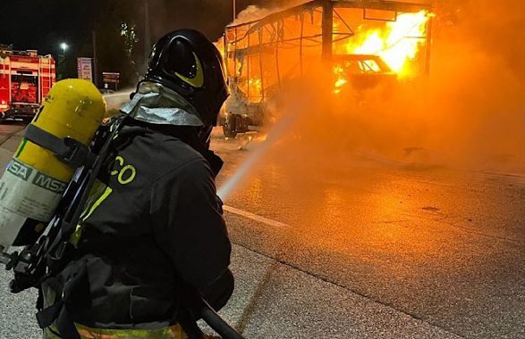 Intervento dei vigili del fuoco della sede piombinese intorno alle 19.30 per un incendio che ha coinvolto un mezzo pesante mentre transitava lungo il viale unità d’italia a Piombino.