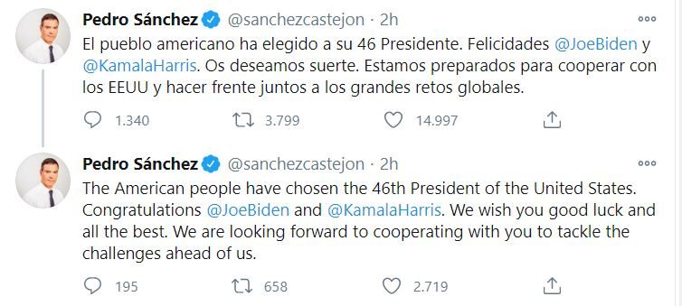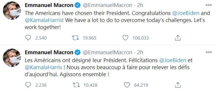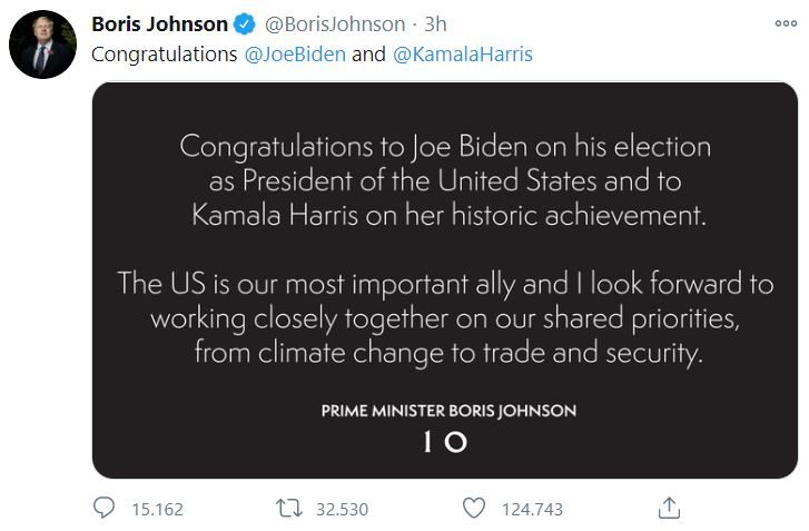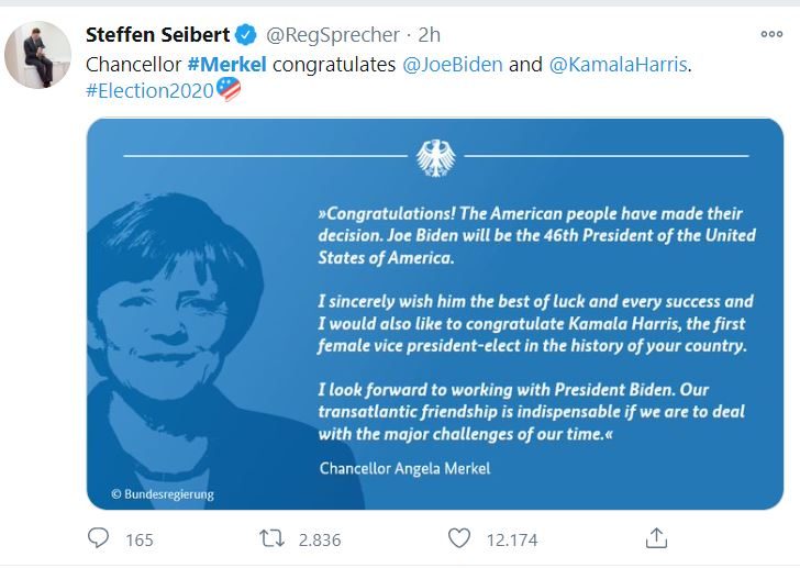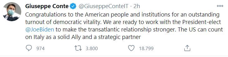 Con il passare delle ore tutto il mondo ha avuto il modo di riceve la notizia del risultato uscito dalle urne americane e le congratulazioni sono decollate. Fra coloro che hanno voluto complimentarsi con il nuovo presidente si contano Angela Merkel, Emmanuel Macron, Pedro Sánchez, Boris Johnson e anche il nostro presidente del consiglio, Giuseppe Conte.