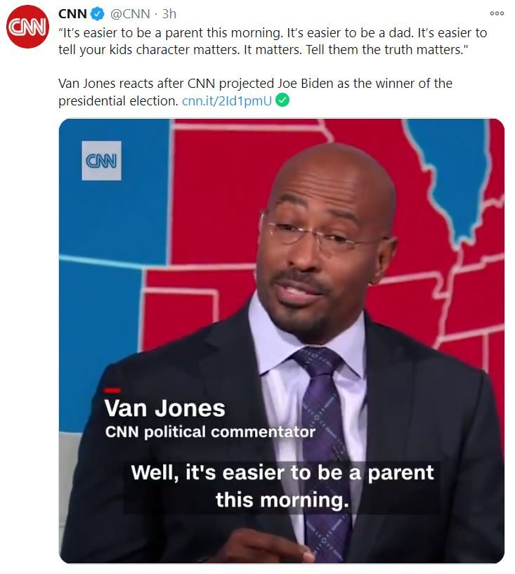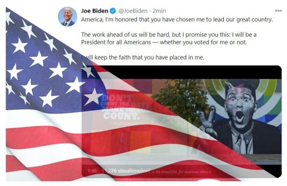 Su tutti vale la pena di ricordare le parole emozionate dell’avvocato e scrittore Anthony Kapel “Van Jones”: “È più facile essere un genitore questa mattina oggi è più facile dire a tuo figlio che è importante essere onesti, oggi è più facile per tanti in questo Paese” ha detto Jones “Voglio solo che i miei figli guardino questo… È facile ottenere le cose con le scorciatoie e farla franca, ma poi torna tutto indietro. Torna indietro. Ed è una buona cosa per questo paese. Sono dispiaciuto per le persone che hanno perso, per loro non è una bella giornata. Ma per molte persone è una buona giornata. Se sei un musulmano in questo paese ora non hai la preoccupazione che il presidente non ti voglia qui. Se sei un immigrato non devi preoccuparti di un presidente che è più felice sei bambini vengono portati via o che vuole rispedire via i DREAMers senza motivo” e poi ha continuato “Il ‘Non riesco a respirare’ non era solo di George Floyd. Molte persone hanno sentito di non riuscire a respirare. Ogni giorno ti svegli e ricevi tweet, poi vai in negozio e le persone che prima avevano paura di mostrare il loro razzismo diventano sempre più cattive con te e tu sei preoccupato per i tuoi figli e sei preoccupato per tua sorella, e ora lei può semplicemente andare da Walmart e tornare in macchina senza che qualcuno le dica qualcosa .” Questo sfogo in diretta sulla CNN racconta bene la vita di tanta gente nell’era di Trump, un periodo che molti sperano sfumi per lasciare il posto all’America migliore.