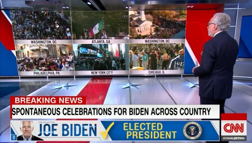 La folla che canta, macchine che strombazzano, musica e bandiere sventolate come alla fine di una guerra, queste sono le immagini restituite dalle strade di Washington, Atlanta, Philadelphia, New York, Chicago, Los Angeles e mandate in onda dalle emittenti americane. Un momento di gioia, una festa diffusa e con mascherina in dotazione.