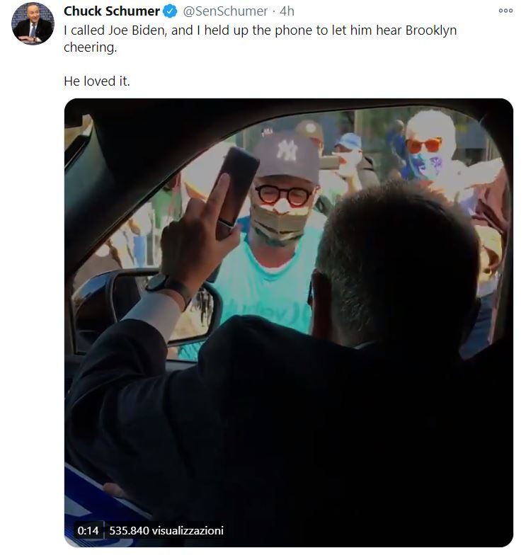 Osservando le reazioni a livello governativo, nella giornata della vittoria di Biden si è fatto vivo il capo dell’attuale minoranza democratica al Senato, Chuck Schumer (NY). Sia lui che la Speaker della Camera Nancy Pelosi hanno sentito il vincitore via telefono, complimentandosi con lui e facendogli gli auguri. Schumer in particolare si trovava in macchina mentre la conversazione aveva luogo e ha approfittato della situazione per far sentire a Joe Biden le voci della folla che faceva gran festa in suo onore.