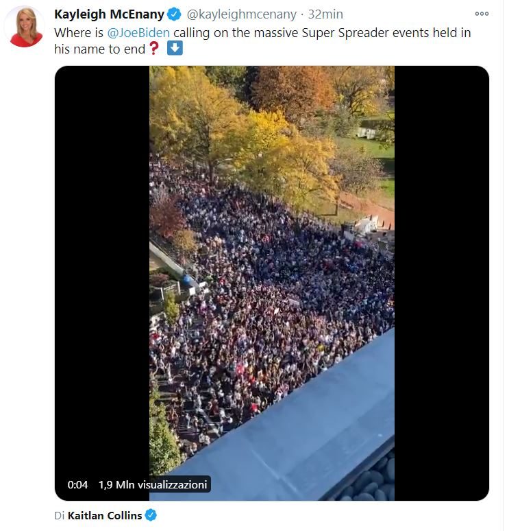 Ovviamente il gran party in strada, che non dà segno di voler finire così facilmente, ha infastidito gli inquilini della residenza presidenziale, come testimoniato dal tweet della portavoce del presidente, Kayleigh McEnany. Questa, fra l’altro, nel suo post ha chiamato in causa Joe Biden chiedendogli dove fosse e perché non chiedesse l’interruzione di questi “Super Spreader events” (eventi di super-diffusione del virus). Un modo come un altro per rimandare la palla dell’accusa nel campo avversario, da cui alcune settimane fa sono arrivati criticismi per la festa organizzata da Donald Trump alla Casa Bianca per presentare il giudice Amy Coney Barrett.