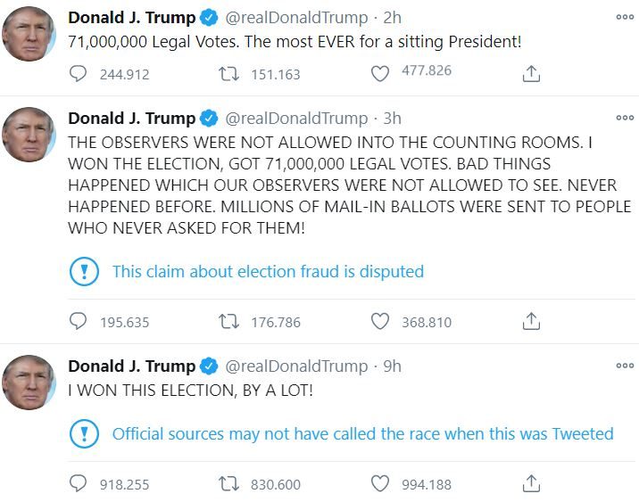 Ma quello che è evidente e lampante a tutti non sposta Trump di un millimetro dalla sua posizione. Oggi infatti il presidente in carica ha insistito a twittare, continuando poi a essere censurato dalla piattaforma Twitter. Nei suoi messaggi si potevano leggere affermazioni come “71,000,000 Legal Votes. The most EVER for a sitting President!” (71.000.000 voti legali. Il massimo in assoluto per un presidente in carica!) oppure “THE OBSERVERS WERE NOT ALLOWED INTO THE COUNTING ROOMS. I WON THE ELECTION, GOT 71,000,000 LEGAL VOTES. BAD THINGS HAPPENED WHICH OUR OBSERVERS WERE NOT ALLOWED TO SEE. NEVER HAPPENED BEFORE. MILLIONS OF MAIL-IN BALLOTS WERE SENT TO PEOPLE WHO NEVER ASKED FOR THEM!” (Agli osservatori non è stato permesso di entrare nella sala di conteggio. Io ho vinto le elezioni, ho ottenuto 71.000.000 di voti legali Sono accadute cose brutte che i nostri osservatori non hanno potuto vedere. Ciò non è mai successo prima. Milioni di schede per posta sono state inviate a persone che non le hanno mai chieste!)