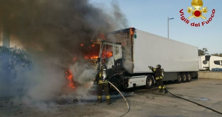 Le fiamme hanno coinvolto interamente la motrice del mezzo pesante.