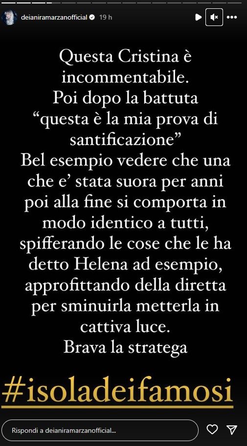 Tra le più critiche c’è Deianira Marzano, esperta di gossip, che in una Storia su Instagram ha attaccato frontalmente la Scuccia: “Questa Cristina è incommentabile. Poi dopo la battuta ‘questa è la mia prova di santificazione’. Bell’esempio vedere che una che è stata suora per anni poi alla fine si comporta in modo identico a tutti, spifferando le cose che le ha detto Helena ad esempio, approfittando della diretta per sminuirla e metterla in cattiva luce. Brava la stratega”.