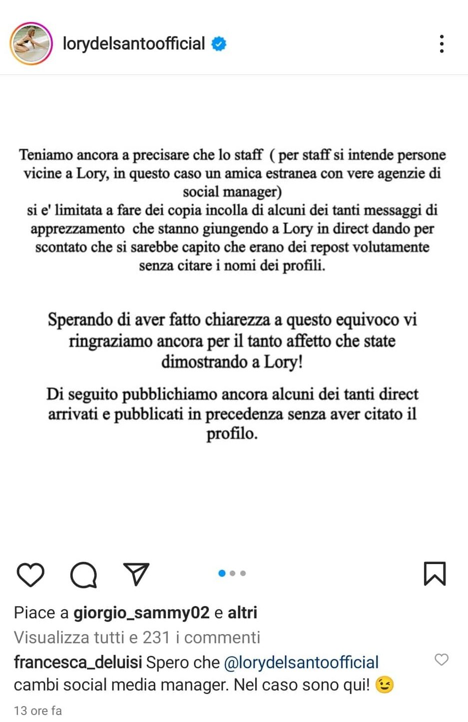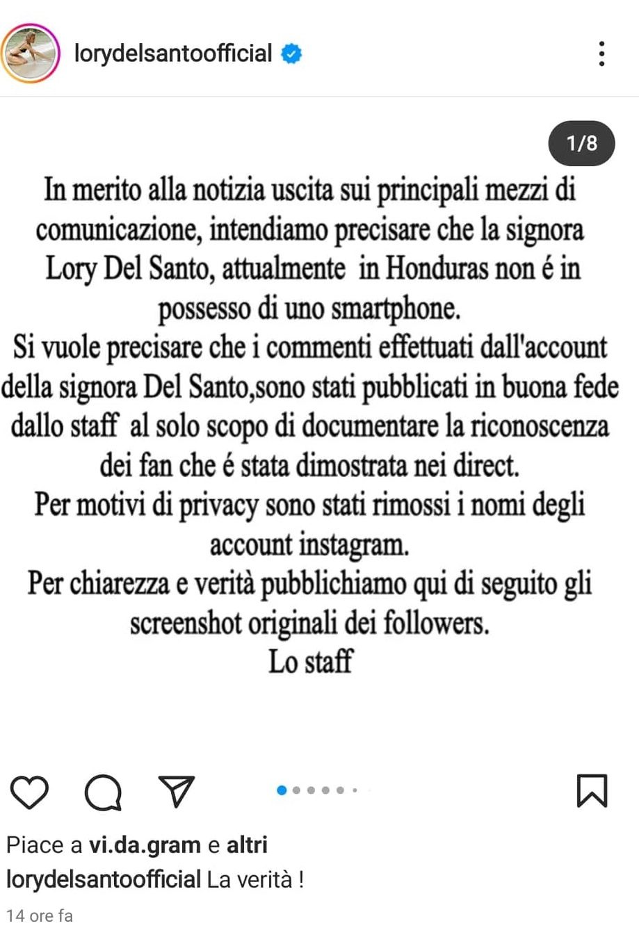 Tutte queste versioni fornite da Lory Del Santo a mezzo Instagram non corrispondono a quanto invece reso noto dal suo staff, che aveva detto: “La signora Lory Del Santo, attualmente in Honduras, non è in possesso di uno smartphone. Si vuole precisare che i commenti effettuali dall’account della signora Del Santo sono stati pubblicati in buona fede dallo staff al solo scopo di documentare la riconoscenza dei fan che è stata dimostrata nei direct”. In un secondo messaggio pubblicato sui social invece di legge: “Teniamo ancora a precisare che lo staff si è limitato a fare dei copia incolla di alcuni dei tanti messaggi di apprezzamento che stanno giungendo a Lory in direct dando per scontato che si sarebbe capito che erano dei repost volutamente senza citare i nomi dei profili”.
