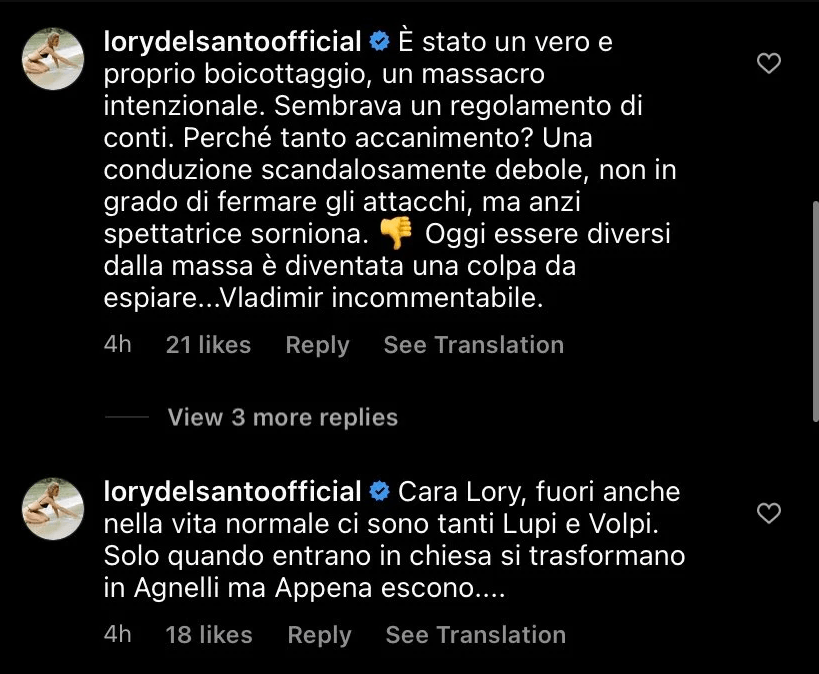Nel post di Instagram di Lory Del Santo all’inizio si vedono frasi di autoesaltazione seguite da imprecazioni in primis nei confronti del programma televisivo e poi nei confronti della conduttrice e degli opinionisti-affiancatori. Nello specifico la conduzione viene definita di basso livello, Savino opinionista non pervenuto e Luxuria soprannominato Signor Vladimiro Guadagno. In un altro messaggio invece la conduzione viene definita scandalosamente debole e di Vladimir incommentabile.