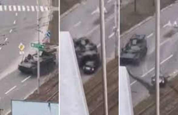 Nella clip, il mezzo militare che sta attraversando una strada di Kiev, percorrendo la corsia di destra, ma appena vede l’auto cambia direzione andare nel senso opposto al suo e schiaccia l’auto.