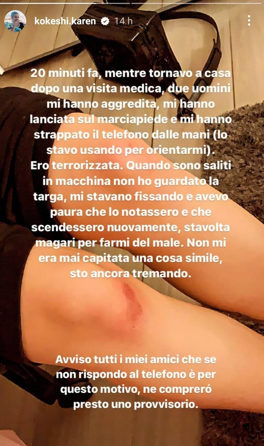 Nella storia di Instagram è stato mostrato il tutto da Karen e anche il racconto di quanto accaduto, anche ricordando la paura di essere attaccata nuovamente da chi se ne stava andando con il suo smartphone: “Due uomini mi hanno aggredita, mi hanno lanciata sul marciapiede e mi hanno strappato il telefono falle mani. Quando sono saliti in macchina non ho guardato la targa, mi stavano fissando e avevo paura che lo notassero e che scendessero nuovamente, stavolta magari per farmi del male”.