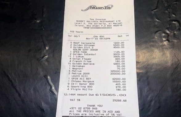 A fare balzare agli onori della cronaca questo ristorante uno scontrino pubblicato sui social, nel quale la cosa più economica, una birra Heineken, costa 14 euro, mentre quella col prezzo più alto è una bottiglia di vino Petrus 2009 Louis XIII da oltre 26mila euro. La somma totale sborsata dalle persone che erano presenti alla cena è stata di 161mila euro, che tradotta in Dhiram, la moneta degli Emirati Arabi, è 615mila. La foto è accompagnata dalla descrizione “La qualità non è mai cara” e lo scontrino è stato emesso nel Nusret Galleria Restaurant di Salt Bae alla The Galleria di Al Maryah Island ad Abu Dhabi. La tavolata era composta da 14 persone e la spesa a testa è stata di poco più di 11mila euro.