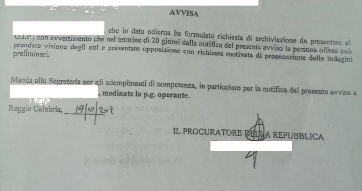C’è una notifica di archiviazione (della Procura della Repubblica presso il Tribunale di Reggio Calabria). Con tutti i timbri e le firme e le indicazioni dovute. È datata 19 ottobre 2019. Viene notificata al diretto interessato, che è un cittadino messinese, il 7 agosto 2020. Quasi dieci mesi dopo.