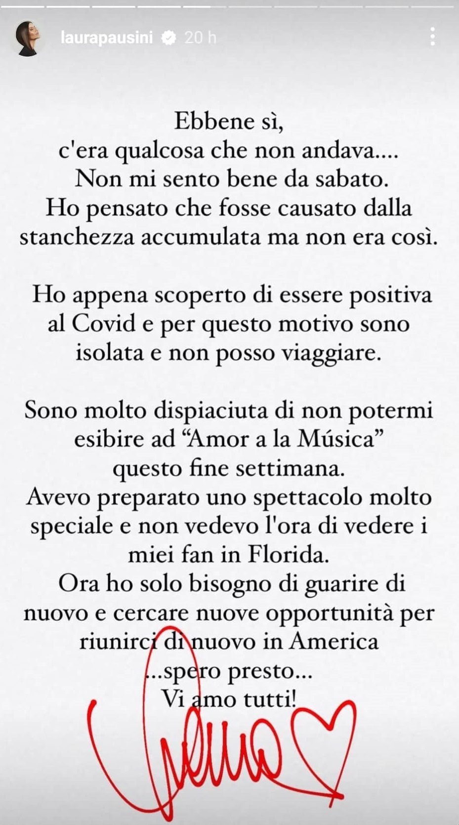 Nel messaggio pubblicato in tre lingue, italiano, inglese e spagnolo, sulle stories di Instagram della Pausini si legge: “Ebbene sì, c’era qualcosa che non andava. Non mi sento bene da sabato. Ho pensato che fosse causato dalla stanchezza accumulata ma non era così. Ho appena scoperto di essere positiva al Covid e per questo motivo sono isolata e non posso viaggiare”. La cantante ha dovuto così anche rinunciare al fine settimana in Florida per una sua nuova performance canora.