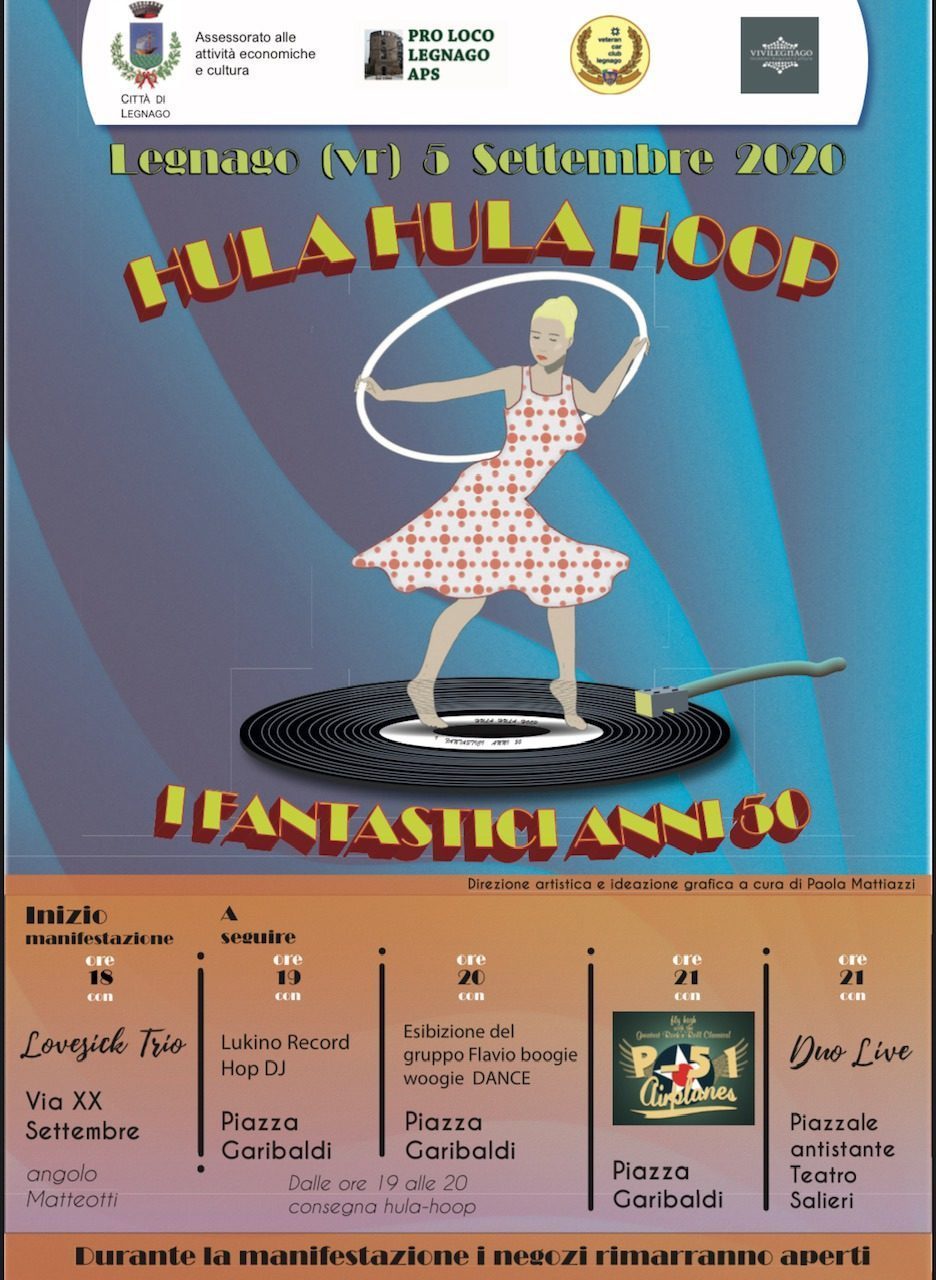 Ideata da Paola Mattiazzi, con il supporto dell’Assessore alle attività economiche Nicola Scapini, dell’Associazione dei commercianti ViviLegnago e della Pro Loco, la serata Hula Hula Hoop – I fantastici anni ’50 inizierà alle 18 in Via XX settembre con la band LoveSick Trio.